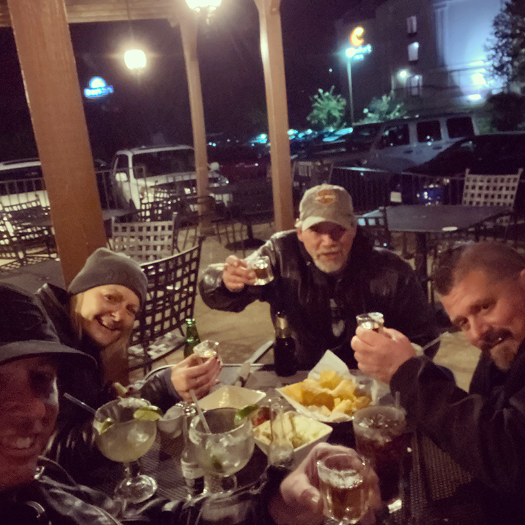 outside. The temps were chilly but we all had our riding gear to layer up with and we had the patio to ourselves. We tossed back a few drinks and ate